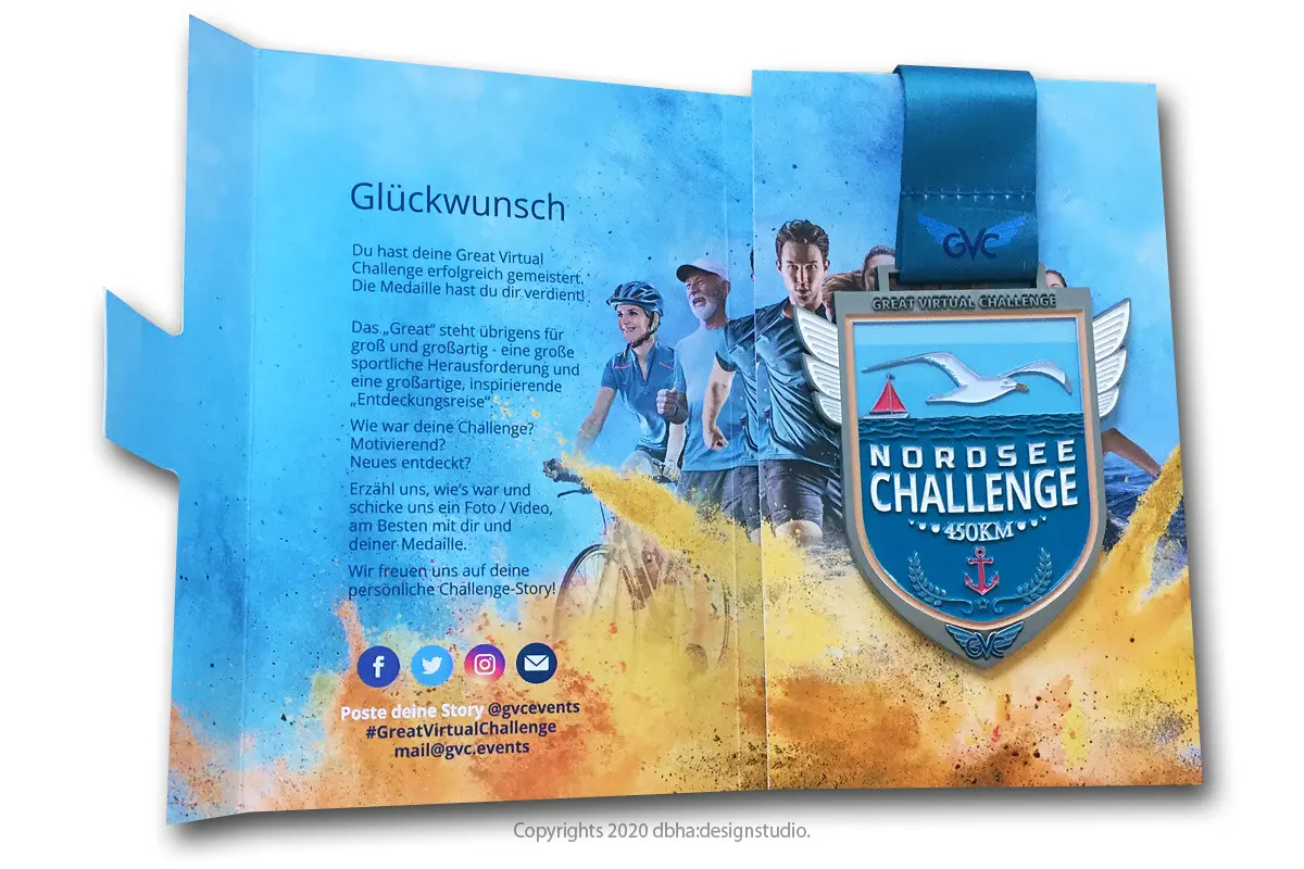 Für den neuen Anbieter von Ausdauer-Challenges wurden im ersten Corona-Pandemie-Jahr (2020) in kürzester Zeit grundlegende Designs erarbeitet. Vom Logo und Elementen des Corporate Designs über die Gestaltung von Key-Visuals für die „Great Virtual Challenges“, bis zu den Entwürfen und Ausarbeitung von Medaillenmotiven sowie Gestaltung von Verpackungen, Gutscheinen, Werbemotiven.